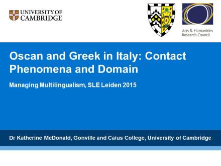 I’ll be presenting in the “Managing Multilingualism” panel, which covers ancient, mediaeval and modern material from all over the world. My paper is called “Oscan and Greek in Italy: Contact Phenomena and Domain”, and it’s based on my forthcoming book. I’d like to share my slides in advance of the conference, so please take a look on this link if you’re interested: McDonald Leiden 2015. I’ll also try to tweet from the conference, WiFi permitting, so keep an eye on the conference hashtag #SLE15.