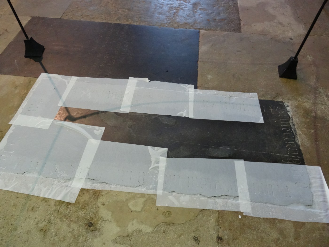 It’s not always possible to make a squeeze, though. Some stone is too soft, or too damaged, to be hit with a squeeze brush without damaging it further. Many of the inscriptions from pre-Roman Italy, for example, are on tufa – a light, bubbly, porous stone which would be more or less impossible to squeeze. In these situations, knowing how to use light and photography can be really helpful. In Exeter Cathedral, some of the most damaged slabs would be too fragile to squeeze, so we experimented with reading them in different ways.