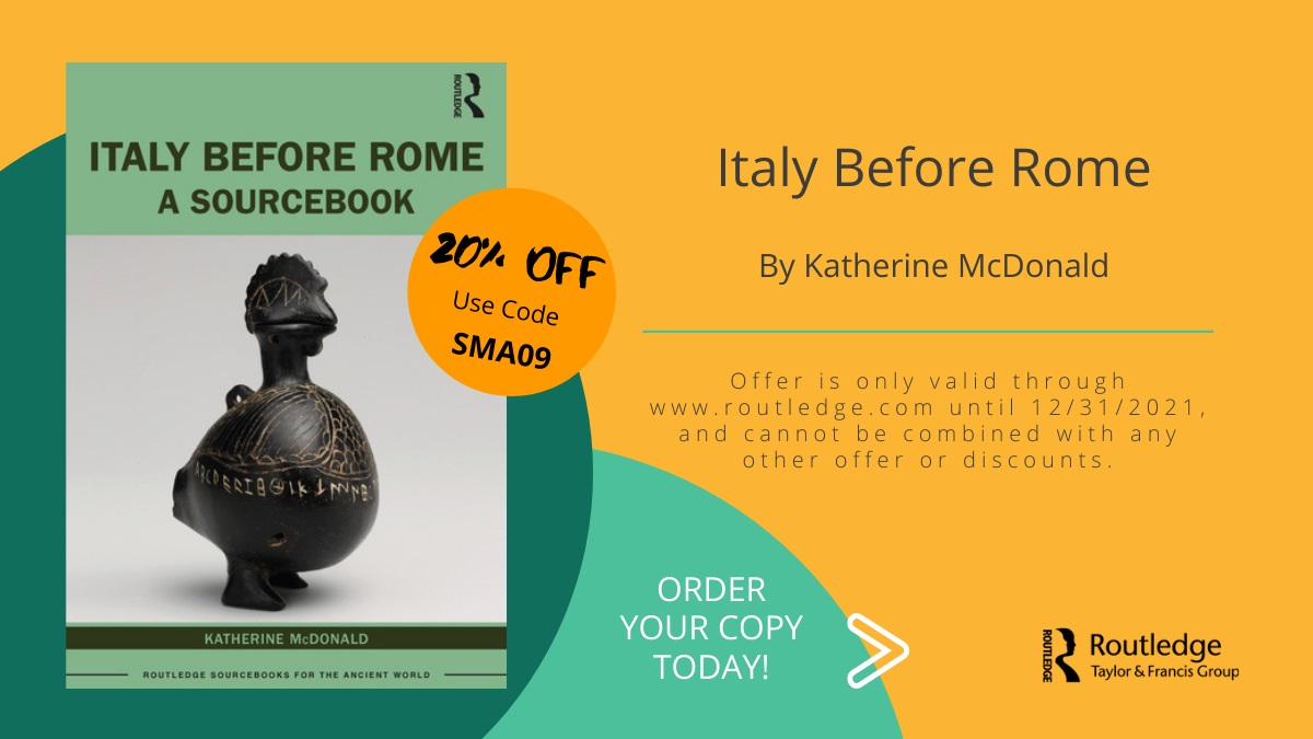 I’m very pleased to say that my new sourcebook, Italy Before Rome, is out on Friday. If you want to use the discount code below, which is valid until the end of 2021, then you can order direct from the publisher on this link: https://routledge.pub/ItalyBeforeRome