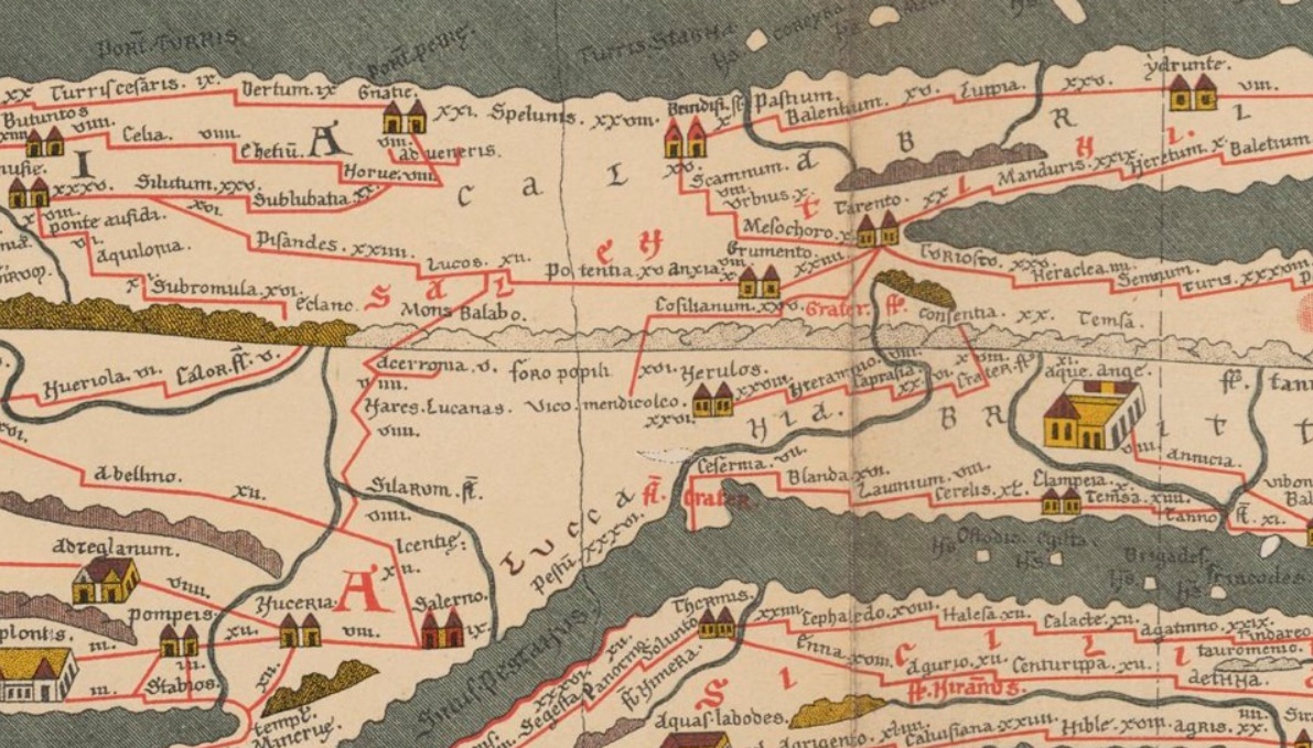 More plausibly, and with more precision about the details, Olivier de Cazanove has hypothesized that the major Lucanian sanctuary of Rossano di Vaglio is marked as a station on the Peutinger Table, a late antique map which may draw on maps from as early as the first century BCE. The name he identifies as Rossano on the map is ‘Lucos’, marked as 12 miles from Potentia – the correct distance for the turn-off one would take from the main road to reach the sanctuary, though not the correct distance from Potentia to the site itself.
